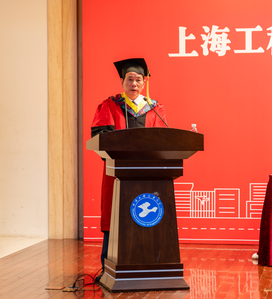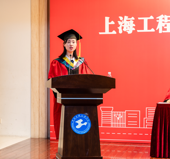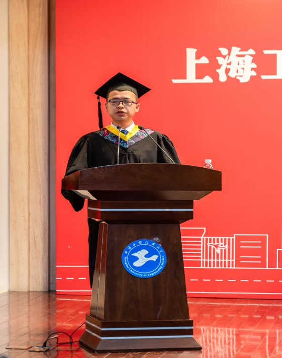 国家奖学金获得者、上海市优秀毕业生陈亚辉同学代表全体毕业生发言,感恩母校的培养,并表示将牢记母校校训,在新的起点继续拼搏。