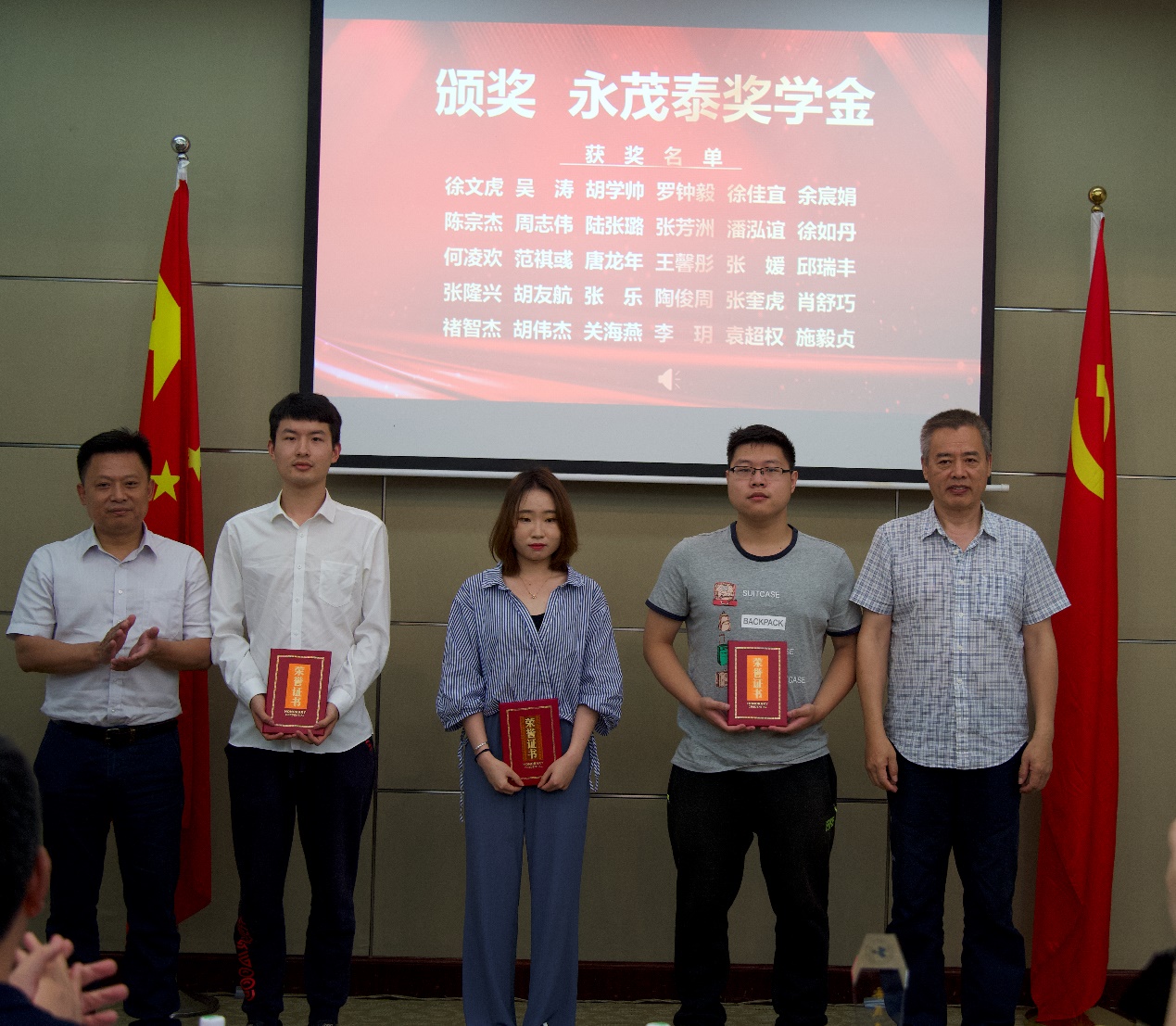 张朝民书记向设奖企业负责人和个人颁发了奖学金纪念杯和捐赠证书。曾国辉主任、梅元媛副部(处)长和李崇桂副经理分别宣读了永茂泰奖学金、龙达奖学金和路逸奖学金的获奖员工名单,并与相关企业负责人共同为获奖员工代表颁发了荣誉证书。