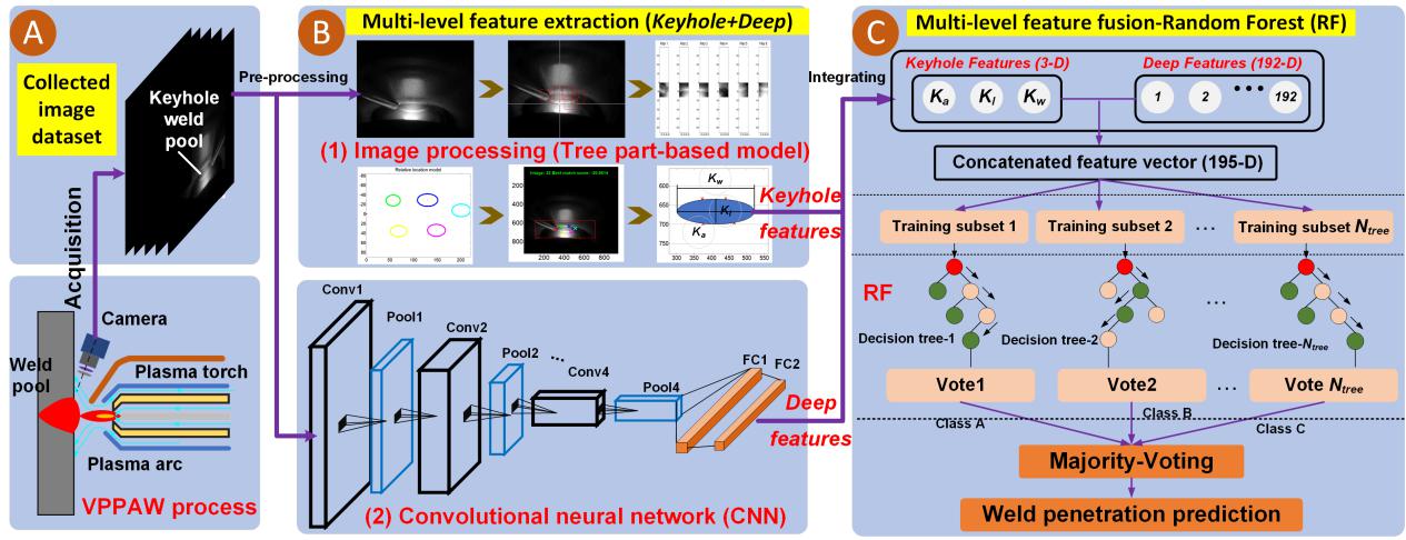针对上述挑战,伟德国际bevictor1946吴頔博士作为公司一流学科精密焊接和高能束制造学科带头人,在上海市激光先进制造技术协同创新中心和上海市III类高峰“材料科学与工程”学科平台的支持下,致力于高能束焊接过程传感及质量诊断方向研究。同时依托于国家自然科学基金(51905333),上海市青年科技英才扬帆计划(19YF1418100)等基金支持,吴頔博士及指导的研究生开展了系列研究:搭建面向等离子弧焊过程的视听觉多信息实时同步传感系统;研究基于视听觉多特征解析的穿孔熔池行为量化分析;构建基于模型验证及多重优化的焊接熔透在线定量评价体系。针对前期研究基础,相关成果多次发表在国外智能制造领域权威SCI期刊(J Manuf Process,中科院二区,IF=4.086;IEEE Access,中科院二区,IF=3.745,Int J Adv Manuf Tech,IF=2.636),并申请国家发明专利4项。