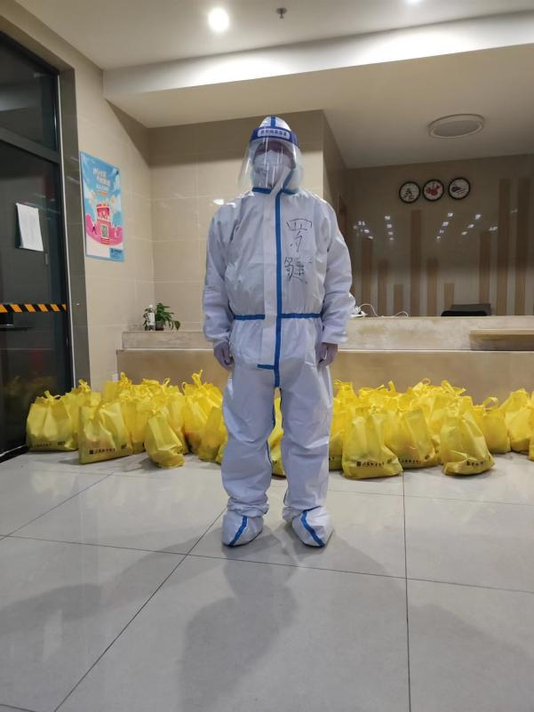 4月5日,因个别员工核酸检测出现异常,集团对相关楼层进行封控管理。罗键老师在完成当日公司2022届毕业研究生硕士论文答辩工作后,向公司指挥部主动请缨,作为志愿者穿上防护服,于当日晚21:00-24:00期间在三期研究生一号楼六层做封控值班服务。期间,罗老师安抚606室两位很晚未领到晚餐的同学的情绪,想尽办法为两位同学筹集应急食物,解决晚餐问题。为6层20余间寝室所有同学分发抗原试剂,查漏补缺,叮嘱员工尽快完成测试并在规定时间上报测试结果,有异常情况需要马上报告;解释并安抚门上贴封条的封闭寝室同学,引导同学们不必惊慌、放平心态,为其解决打开水等生活需求;引导在公共自习室准备硕士毕业答辩的同学保持安全距离,注意个人防护,以平和情绪正确处理好防疫与毕业论文答辩之间的关系;嘱咐所有同学在宿舍内注意佩戴口罩,提醒同学们注意防疫要求,做好个人卫生,做到勤洗手、戴口罩、勿扎堆,保持稳定良好情绪,按时作息。罗老师圆满完成了公司疫情指挥部交待的封控值班任务。